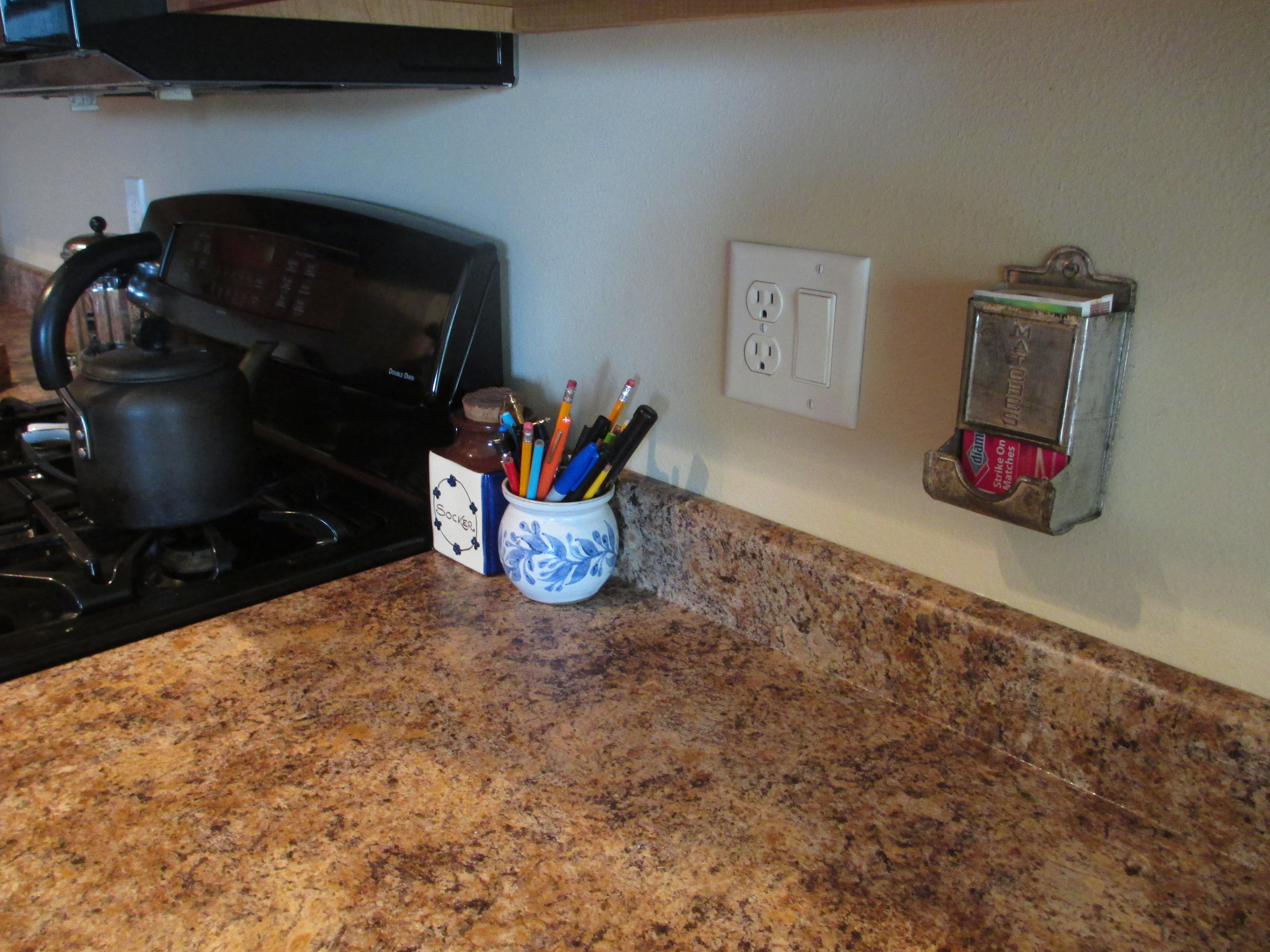 It took a few years of moving around the country before Tony and I hung the match box. Like many of our possessions in the early years of our marriage, it remained boxed up with other gifts or trinkets from our separate travels or lives before each other. Now the matchbox hangs next to our modern gas stove which will never need its usefulness.  The receptacle overflows with matches for our dinner candles and not our daily bread.