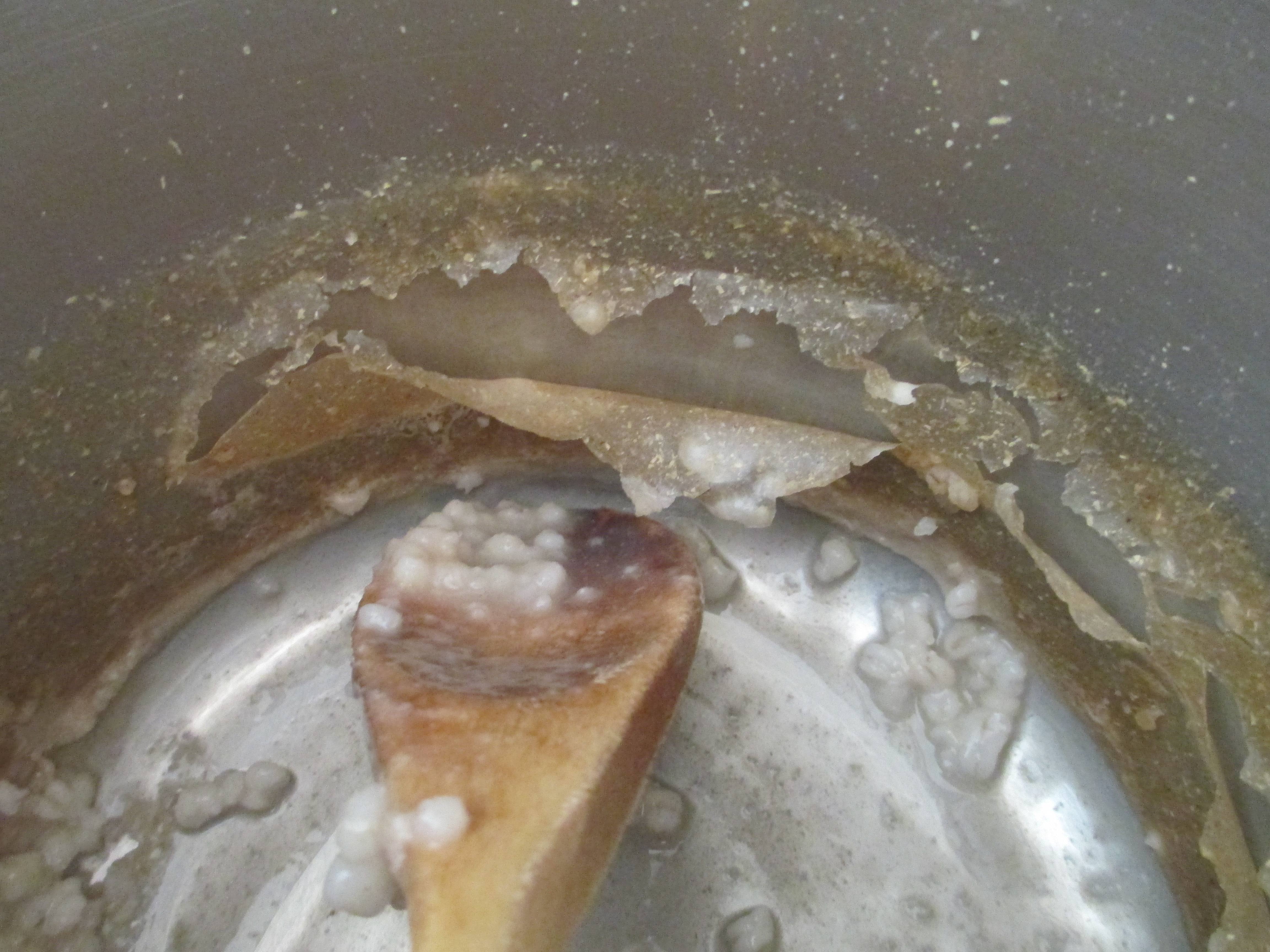Thirty minutes later and with some stirring the mixture came away from the pot sides and looked something like oatmeal but not really and had an unappetizing orange brownish tinge to it.  The groats crunched in my mouth however so in went another half cup of water followed by more stirring until my gruel boiled and simmered for another fifteen minutes or so. Still the groats required too much munching so in went another half cup of water and more stirring, boiling, and simmering for an additional fifteen minutes.