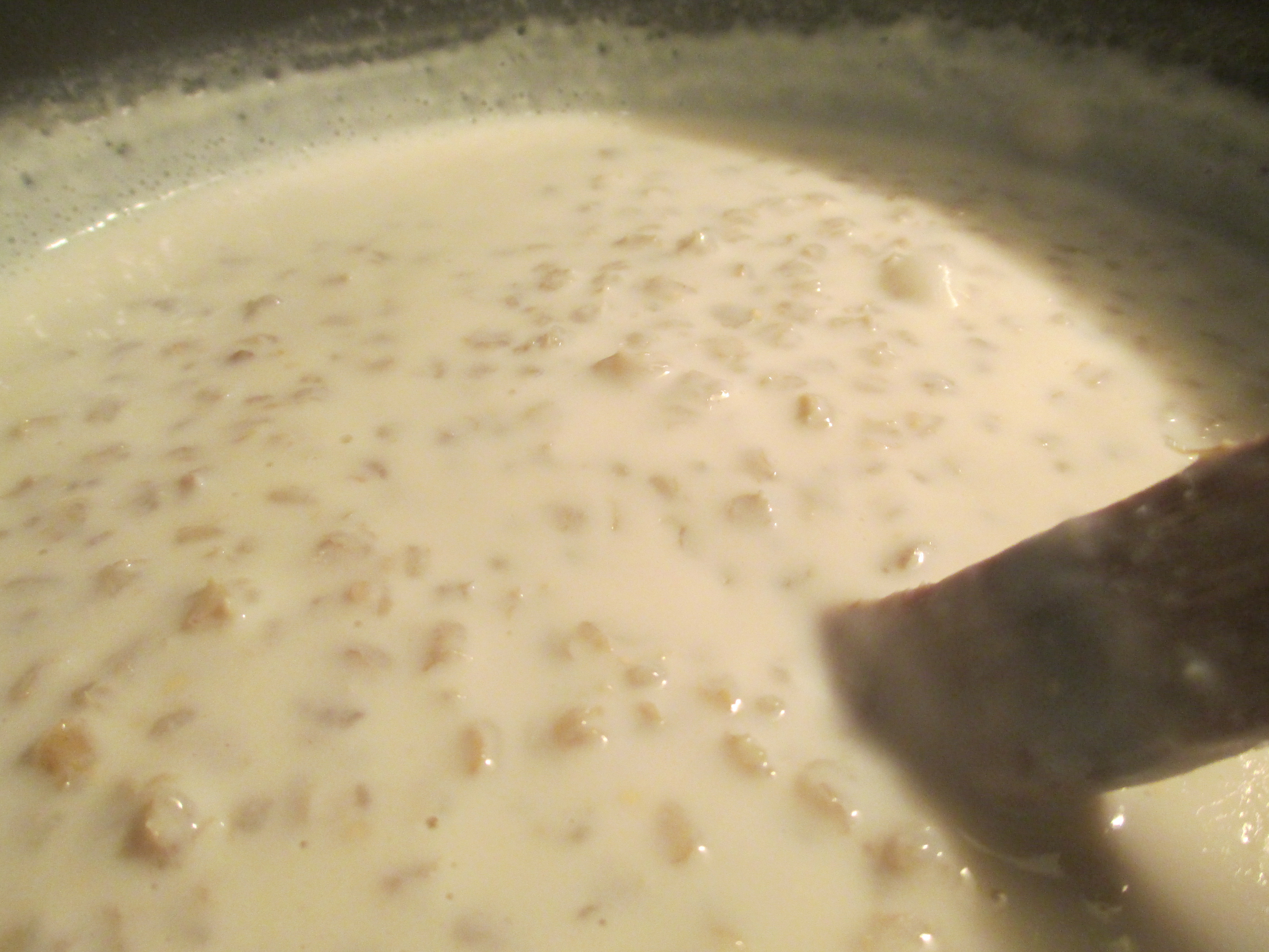 This time I began with whole barley groats pouring two cups worth into a big pot filled with water.  The groats soaked for about twenty hours plumping up and looking ready to cook.  Following an online recipe I then added 8 ½ cups of milk heating the mixture over medium heat while stirring.